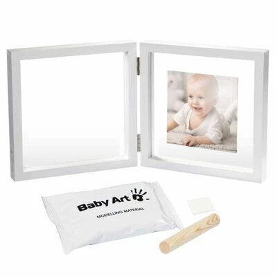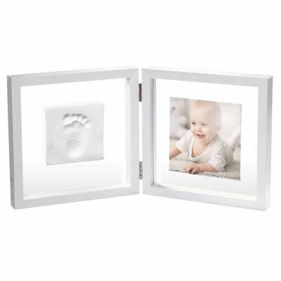 Ce cadre photo moderne en bois blanc contient tout ce dont vous avez besoin pour créer un souvenir personnalisé avec les empreintes minuscules de votre nouveau-né. Pour créer une empreinte, créez un petit coussinet en pâte à modeler et appuyez la main ou le pied de votre bébé sur le coussinet. Laissez sécher et fixez-le sur la surface blanche du cadre à l’aide du tampon collant fourni.