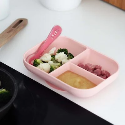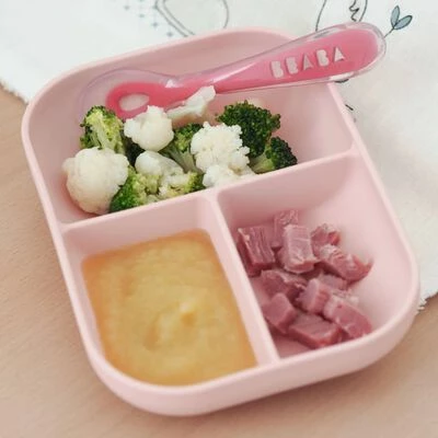 Cet ensemble d’assiette pour bébé à 2 compartiments de la marque Beaba comprend une assiette de repas en silicone à 3 compartiments et une cuillère de deuxième groupe d’âge, et est parfait pour aider les parents à commencer le sevrage de leur bébé.