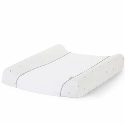 Avec cette housse de coussin, vous trouverez le changement de couche beaucoup plus facile. De plus, elle est agréable et doux pour la peau sensible du bébé. Au milieu, la housse est en coton éponge absorbant blanc. Sur les côtés, elle est réalisée en jersey de coton à pois dorés tendance.