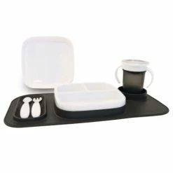 Cet ensemble de vaisselle enfant en silicone et plastique blanc de la marque DERYAN apprend votre enfant à manger de manière responsable.