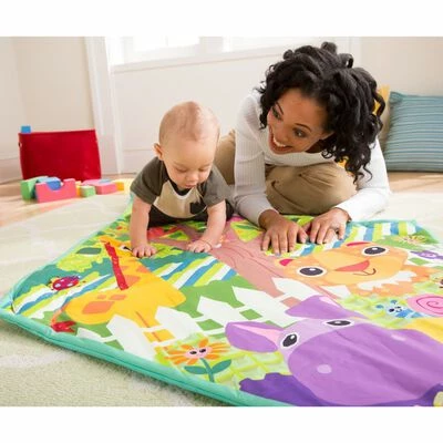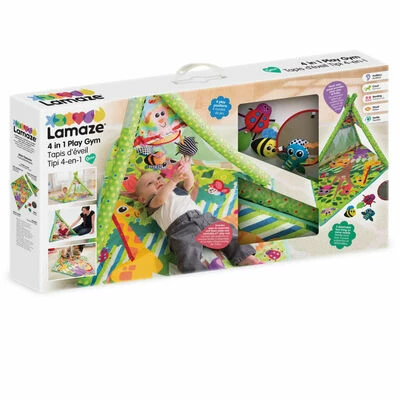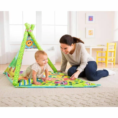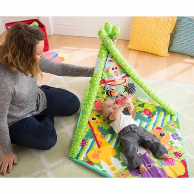 Ce tapis de jeu 4-en-1 de la marque Lamaze avec une impression colorée d’animaux offre quatre façons de jouer: s’allonger et jouer, s’asseoir et explorer, ramper dans un tunnel et jouer dans un tipi.