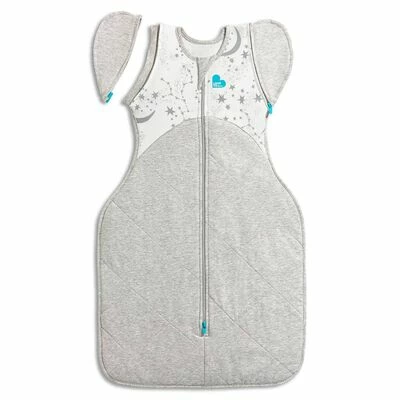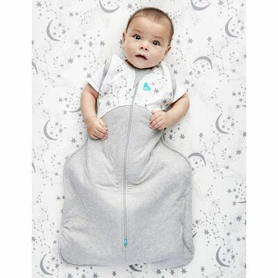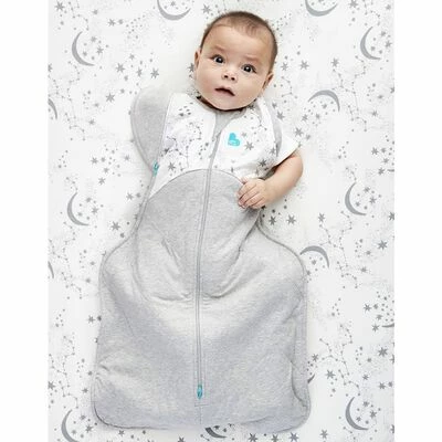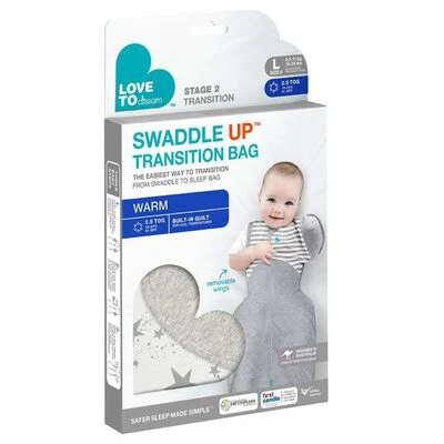 Cette couverture blanche et grise pour bébés L Swaddle UP Transition de la marque Love to Dream garde votre bébé confortablement au chaud, sans avoir à vous soucier des couvertures à retirer pendant le sommeil. Le Swaddle UP Transition est un sac de couchage pratique pour bébés de 6 à 9 mois.