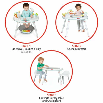 Au fur et à mesure que le bébé grandit, le centre d’activités se transforme pour une utilisation facile. Au stade trois, il se transforme en une solide table pour tout-petits avec une surface de tableau en plastique pour le dessin. Quand il s’agit de jouer, il n’y a pas de limite!